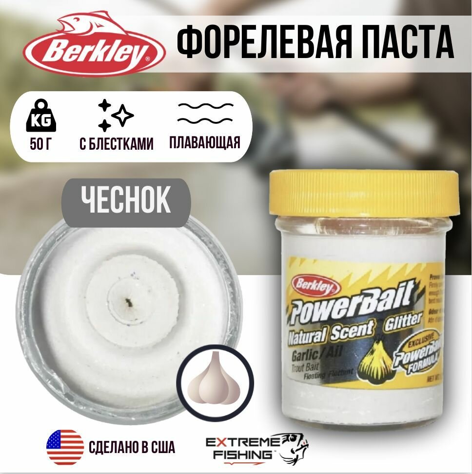 Паста форелевая Berkley Powerbait Natural Scent Glitter Trout Bait Garlic White (чеснок белый) 50гр