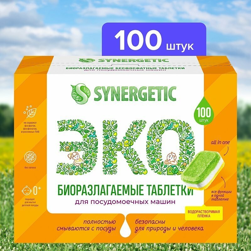 Таблетки для посудомоечных машин бесфосфатные Synergetic, без запаха, 100 шт