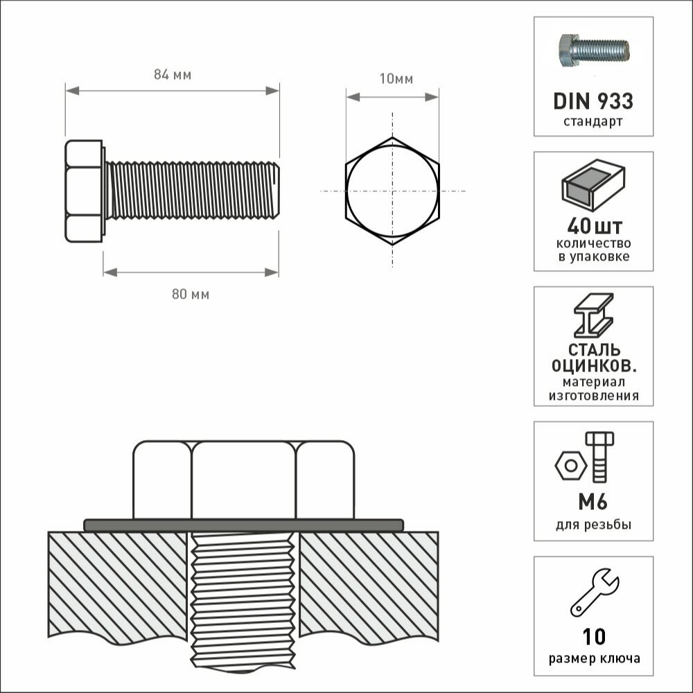 Болт оцинкованный M6x80 мм DIN 933 (40 шт.)