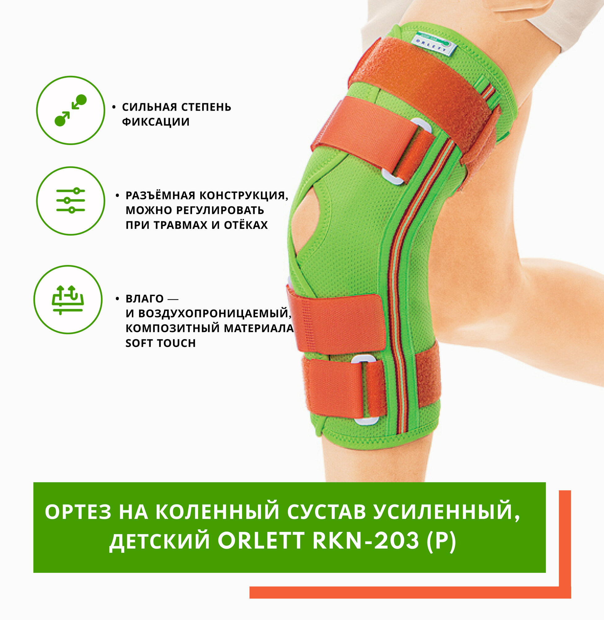ORLETT Х0041386 Ортез (тутор) на коленный сустав детский, разъемный Orlett RKN-203(P) (L / Ярко-зеленый с элементами оранжевого)