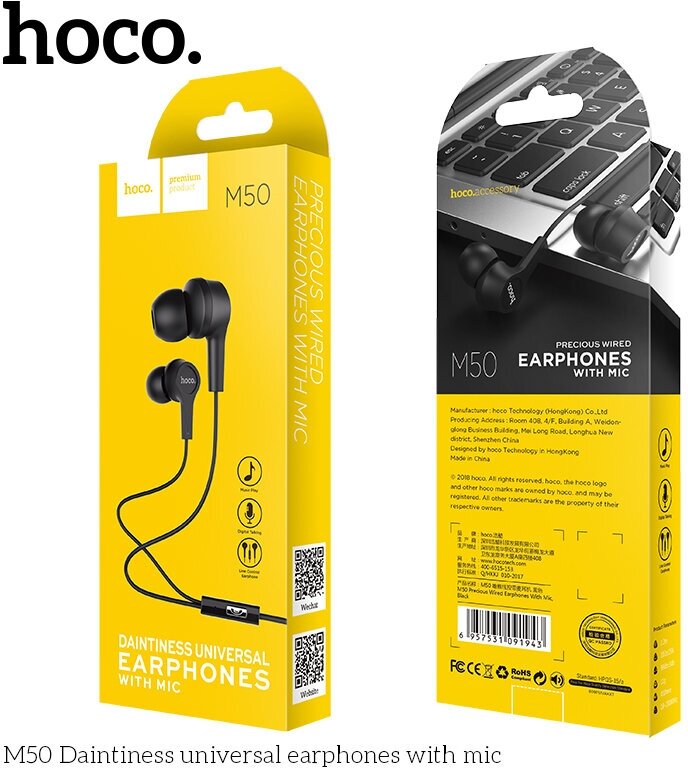 Гарнитура HOCO M50, Daintiness, микрофон, кнопка ответа, кабель 1.2м, цвет чёрный