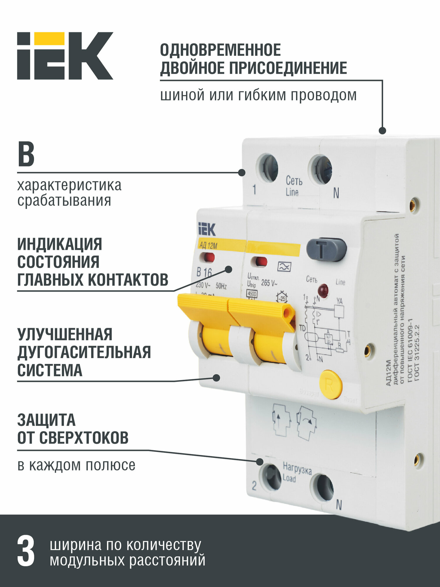 Выключатель автоматический дифференциальный АД12М 2п 16А B 30мА тип A (3 мод) | код. MAD12-2-016-B-030 | IEK ( 1шт. )