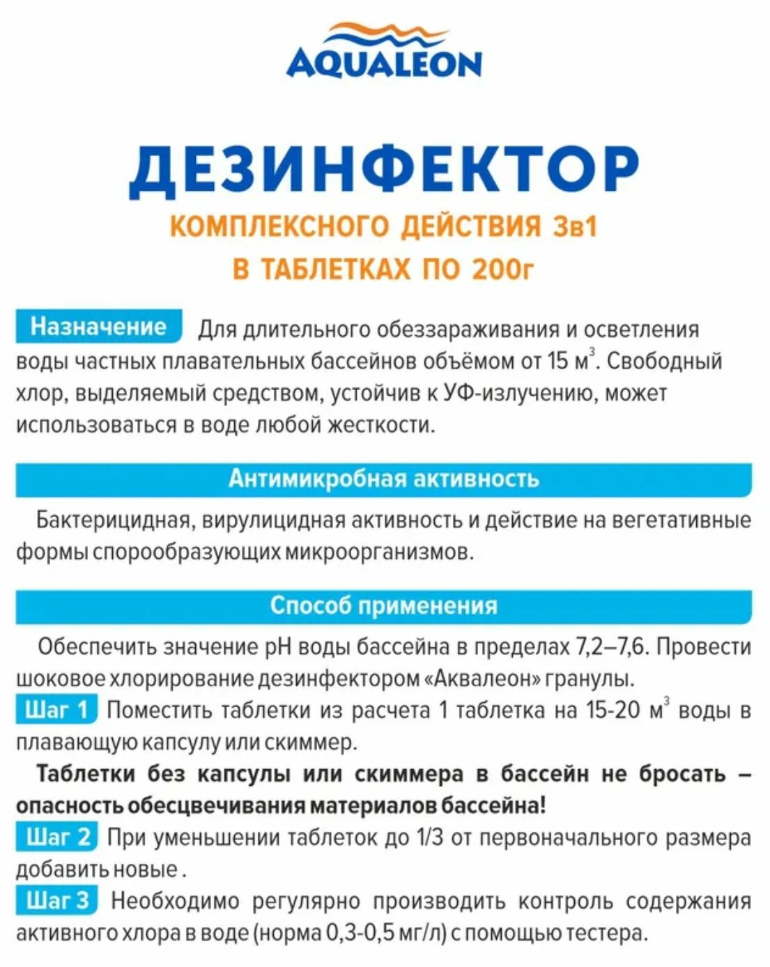 Медленный хлор для бассейна (МСХ КД) Aqualeon комплексный таблетки по 200 гр., 0,6 кг