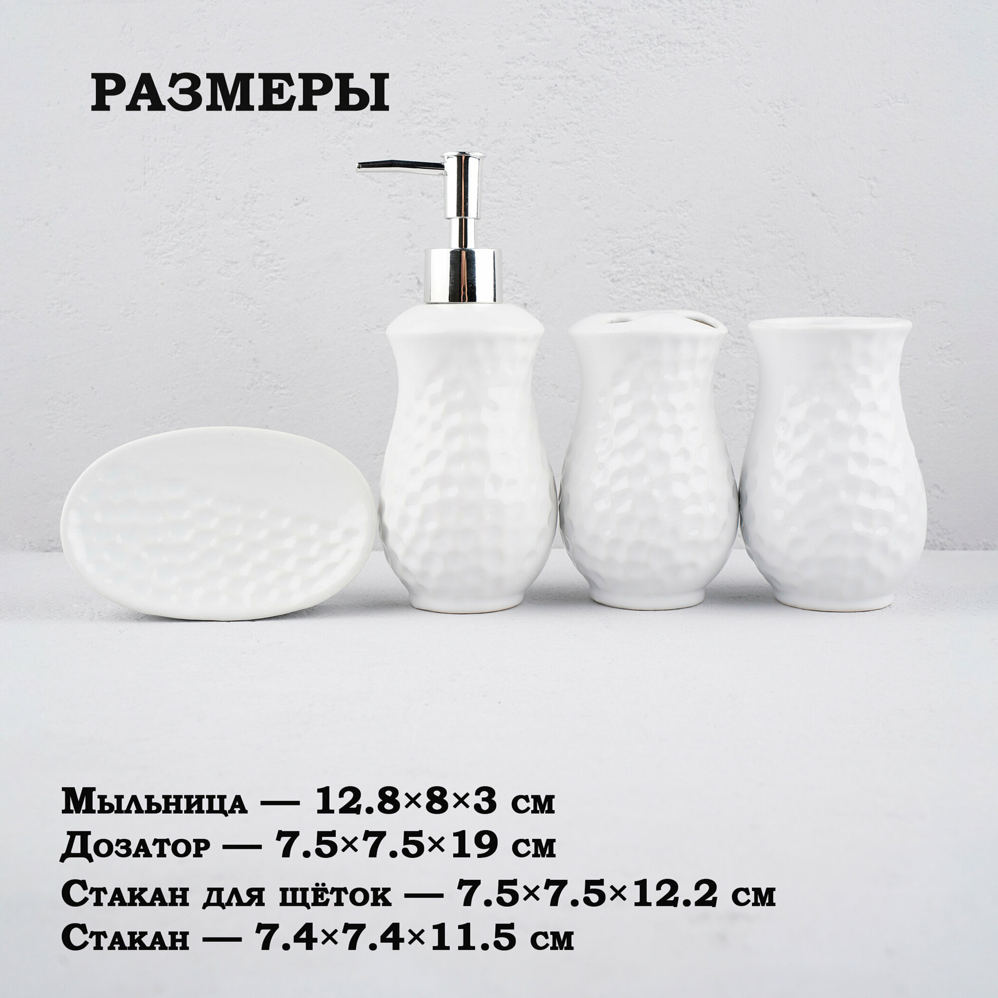 Аксессуары для ванной Доляна «Рельеф», набор 4 предмета, дозатор, мыльница, стаканы, цвет белый