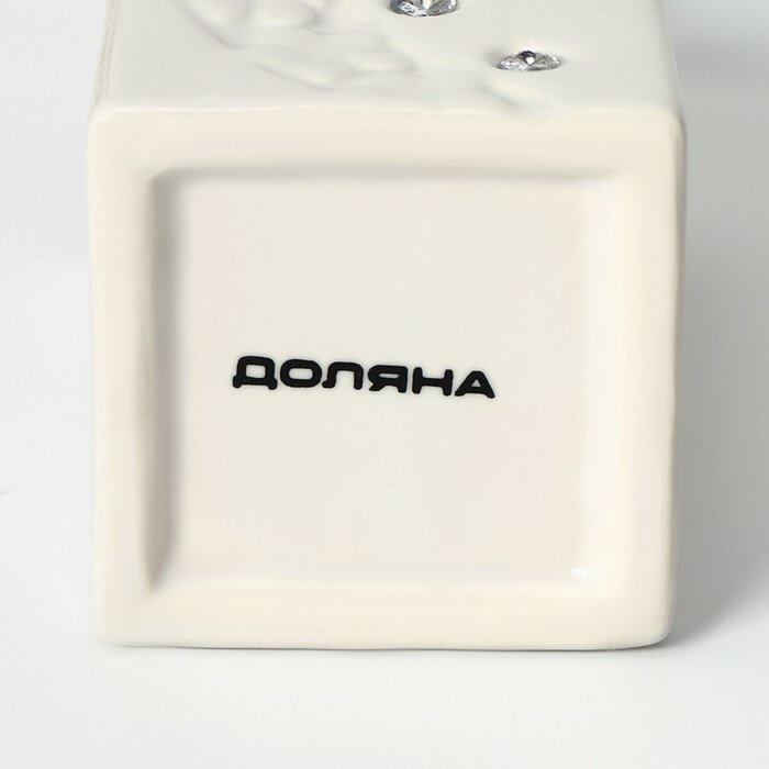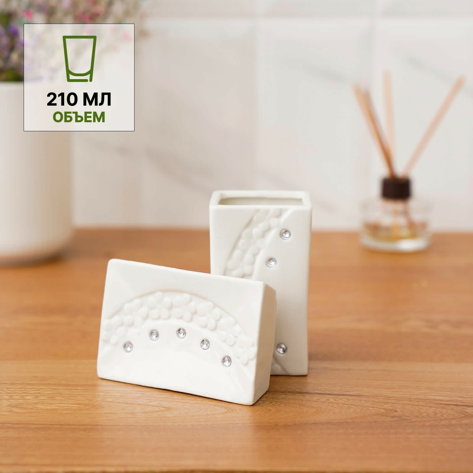 Набор аксессуаров для ванной со стразами Доляна "Цветочный барельеф", 4 предмета: мыльница, дозатор для мыла 270 мл, 2 стакана под зубные щетки и пасту 210 мл, цвет белый
