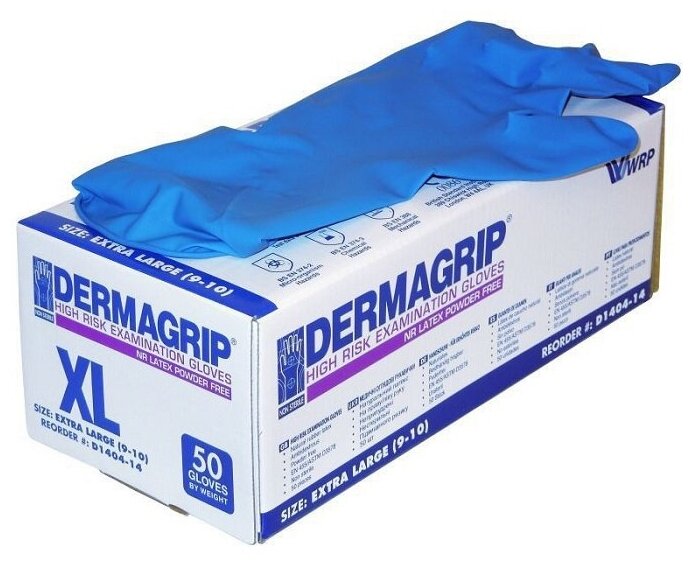 DERMAGRIP Перчатки латексные неопудренные High Risk, смотровые, нестерильные, текстурированные, размер XL, 35 гр, 50 шт/уп (25 пар), цвет голубой