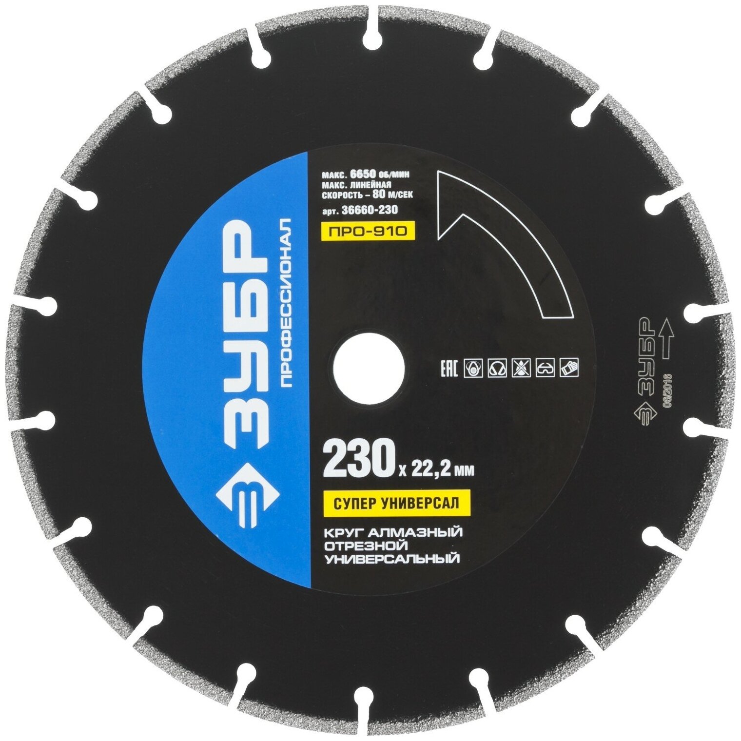 Отрезной алмазный круг ЗУБР профессионал 230x22.2 мм, сегментный, универсальный, на вакуумной пайке 36660-230