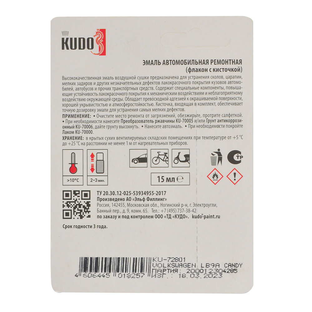 Ku-72801_Эмаль! Автомоб. Ремонт. С Кисточкой 'Volkswagen Lb9a Candy' (Белый) 15Мл Kudo арт. KU72801