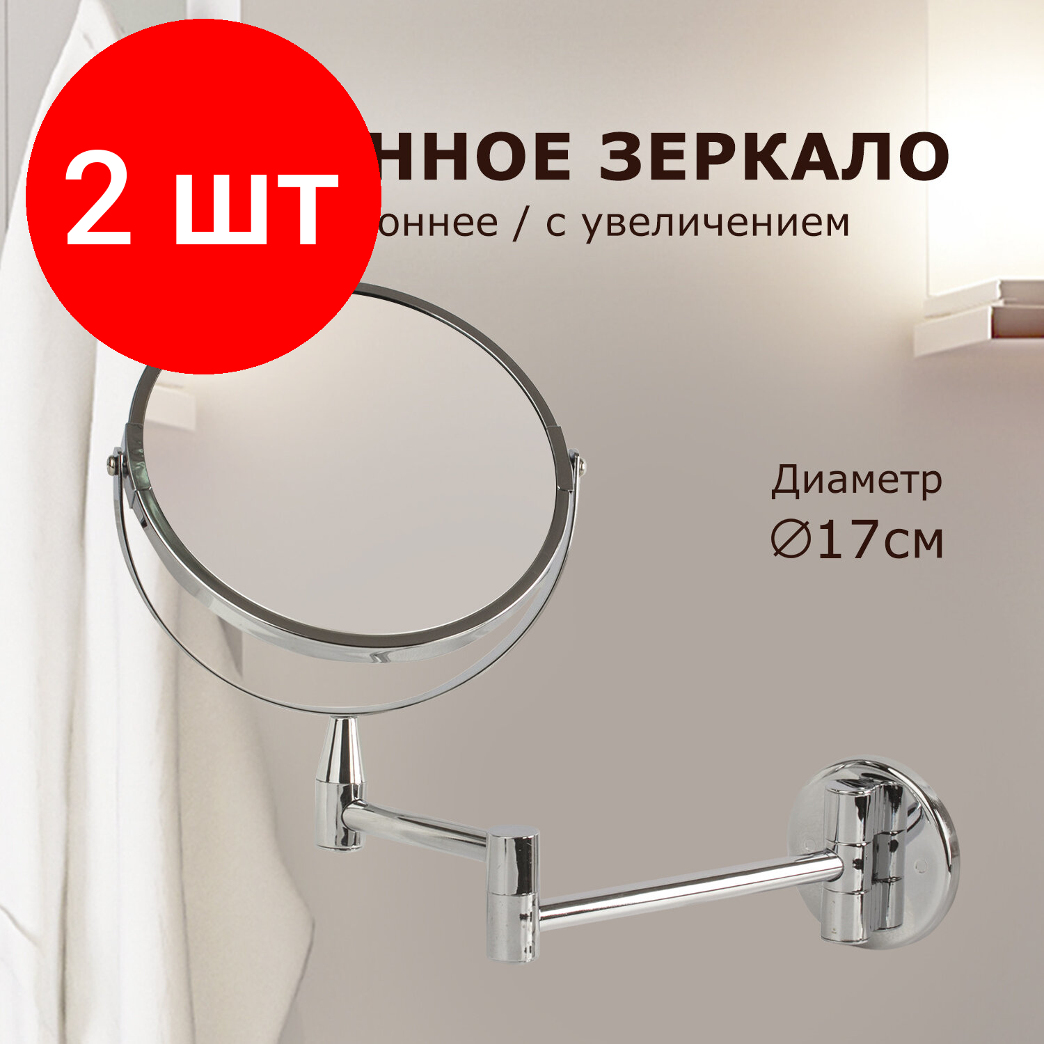Зеркало косметическое настенное Brabix, d=17см, двустороннее с увеличением (604952)