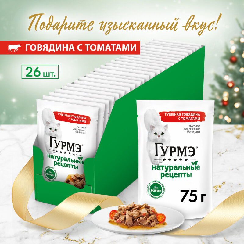 Влажный корм Гурмэ Натуральные рецепты для кошек, тушеная говядина с томатами 75 г х 26 шт