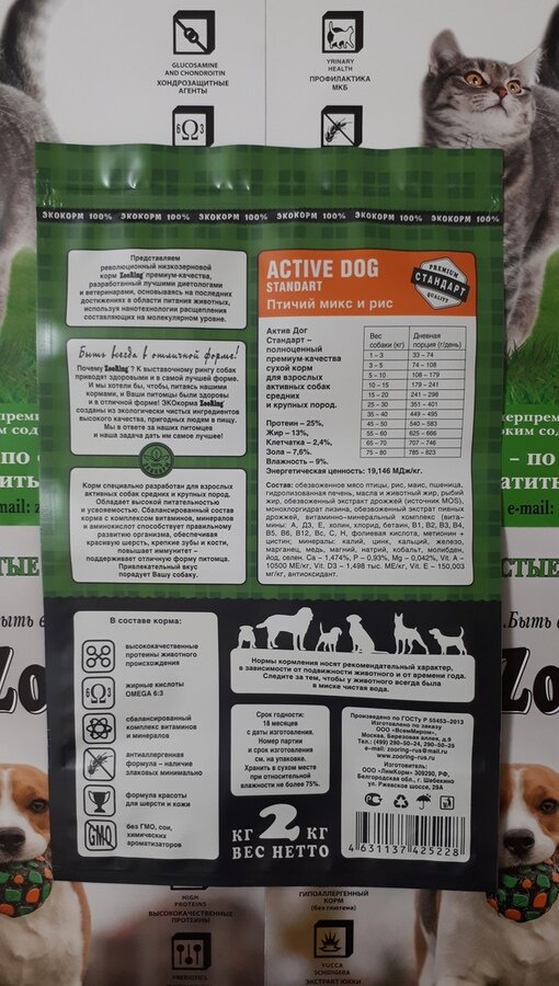 ZOORING ACTIVE DOG STANDART для активных взрослых собак средних и крупных пород с птичьим миксом (2 кг)