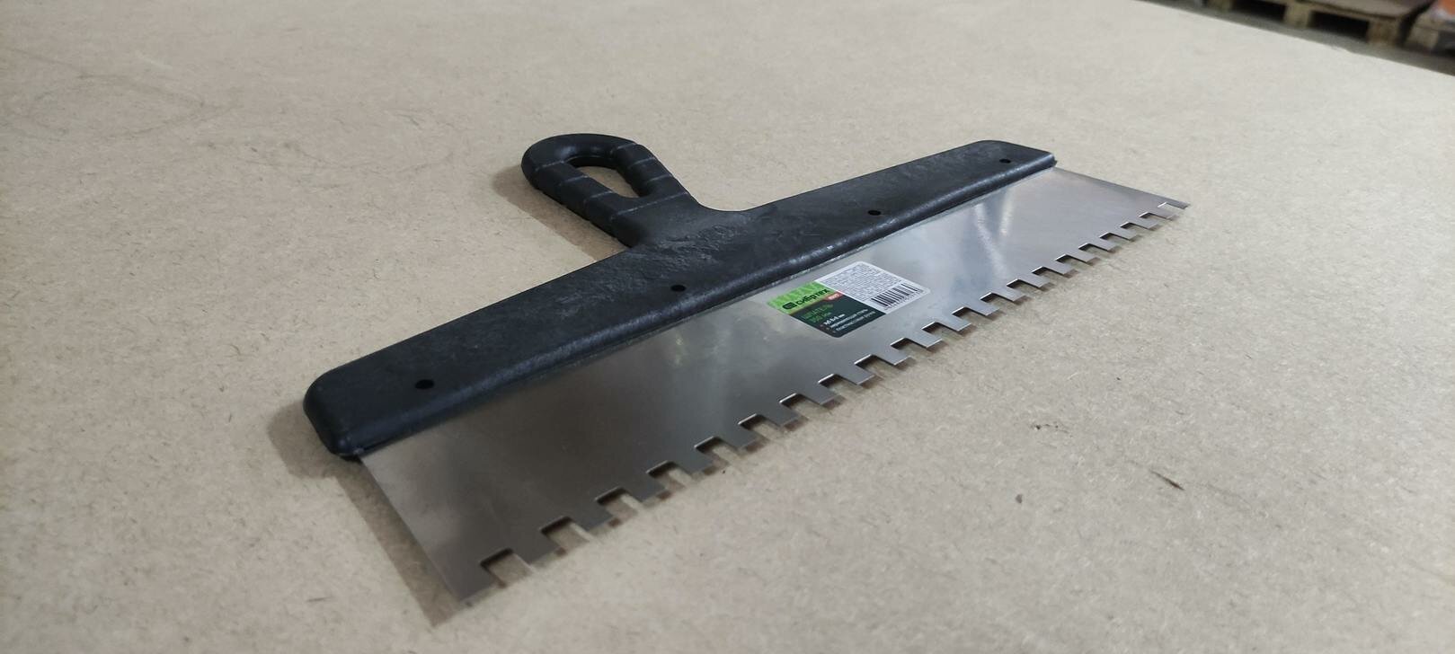 СохранитьШпатель из нержавеющей стали, 350 мм, зуб 8х8 мм, пластмассовая ручка СибрТех [85477] интересное: