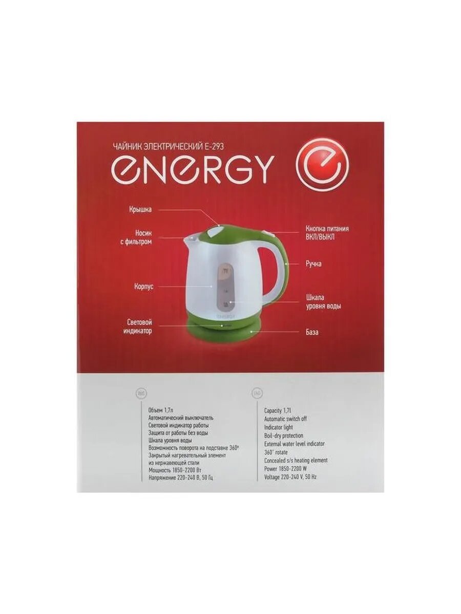 Чайник электрический ENERGY E-293, пластик, 1.7 л, 2200 Вт, бело-зеленый Energy 5137440
