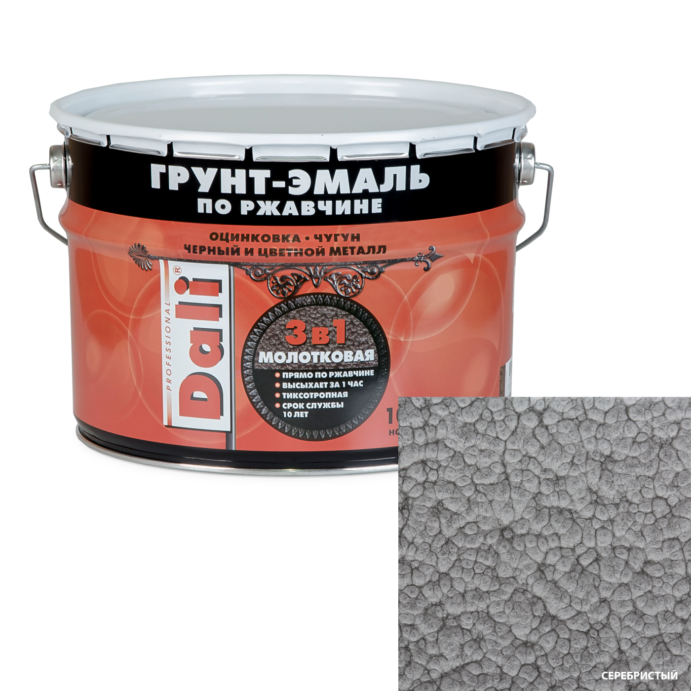 Грунт-Эмаль по Ржавчине 3 в 1 Dali 10л Серебристый с Молотковым Эффектом / Дали Грунт-Эмаль.