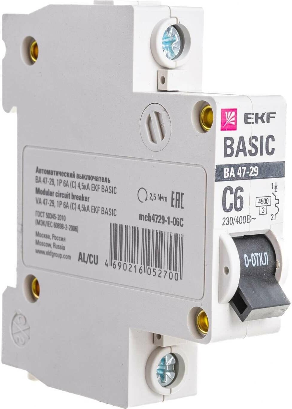 Выключатель автоматический 1-пол. (1P) 6А C 4.5кА ВА47-29 Basic EKF