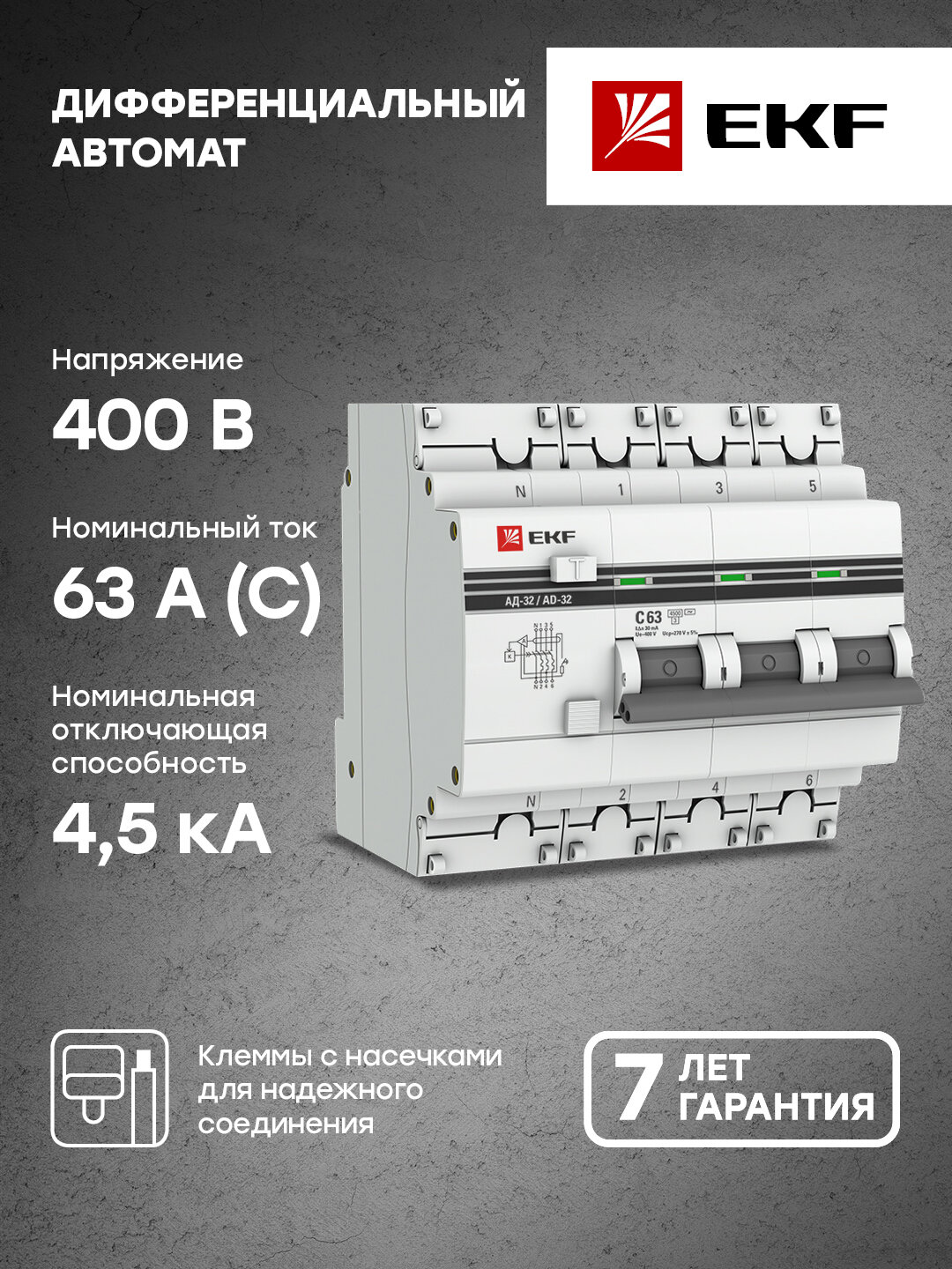 EKF PROxima АД-32 Диф. Автомат (C) 3P+N 63А/30мА тип АС 4,5кА , электронный