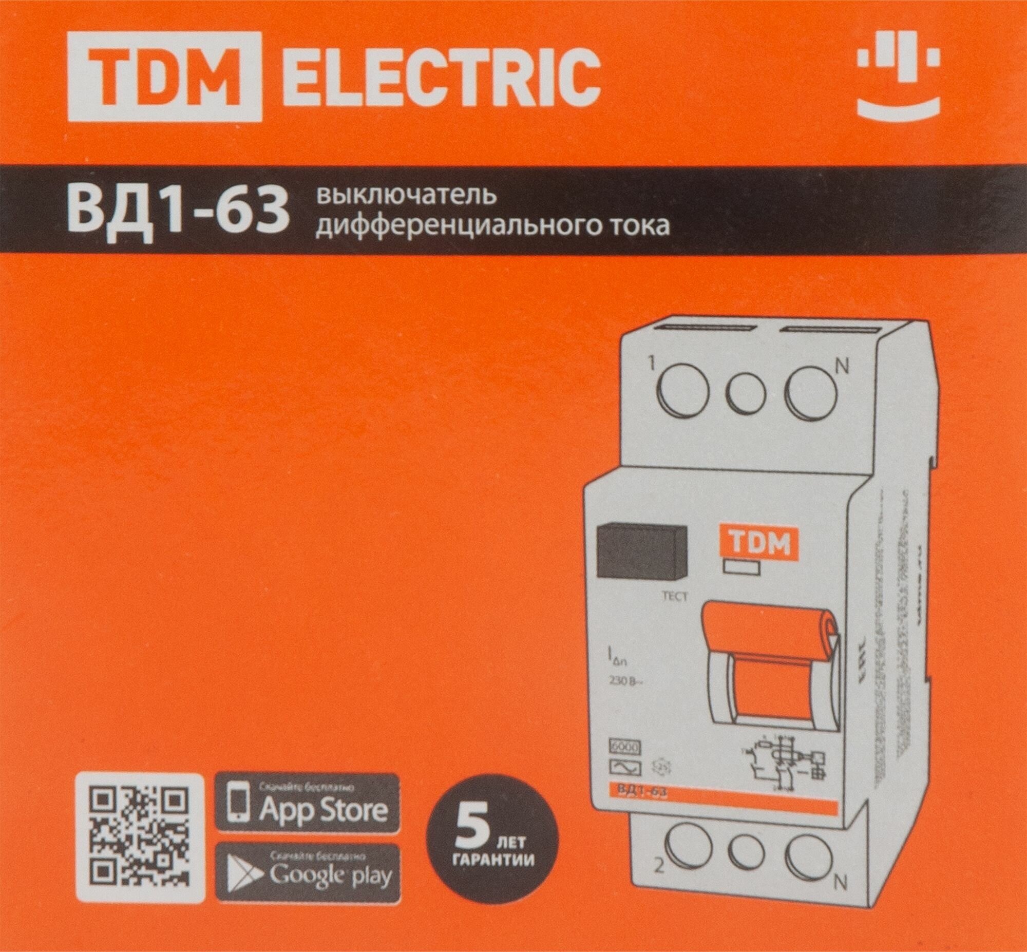 ТДМ Электрик ВД1-63 УЗО 2Р 63А хар-ка АС 30мА / TDM Electric ВД1-63 устройство защитного отключения 2 полюса 63А хар-ка АС 30мА