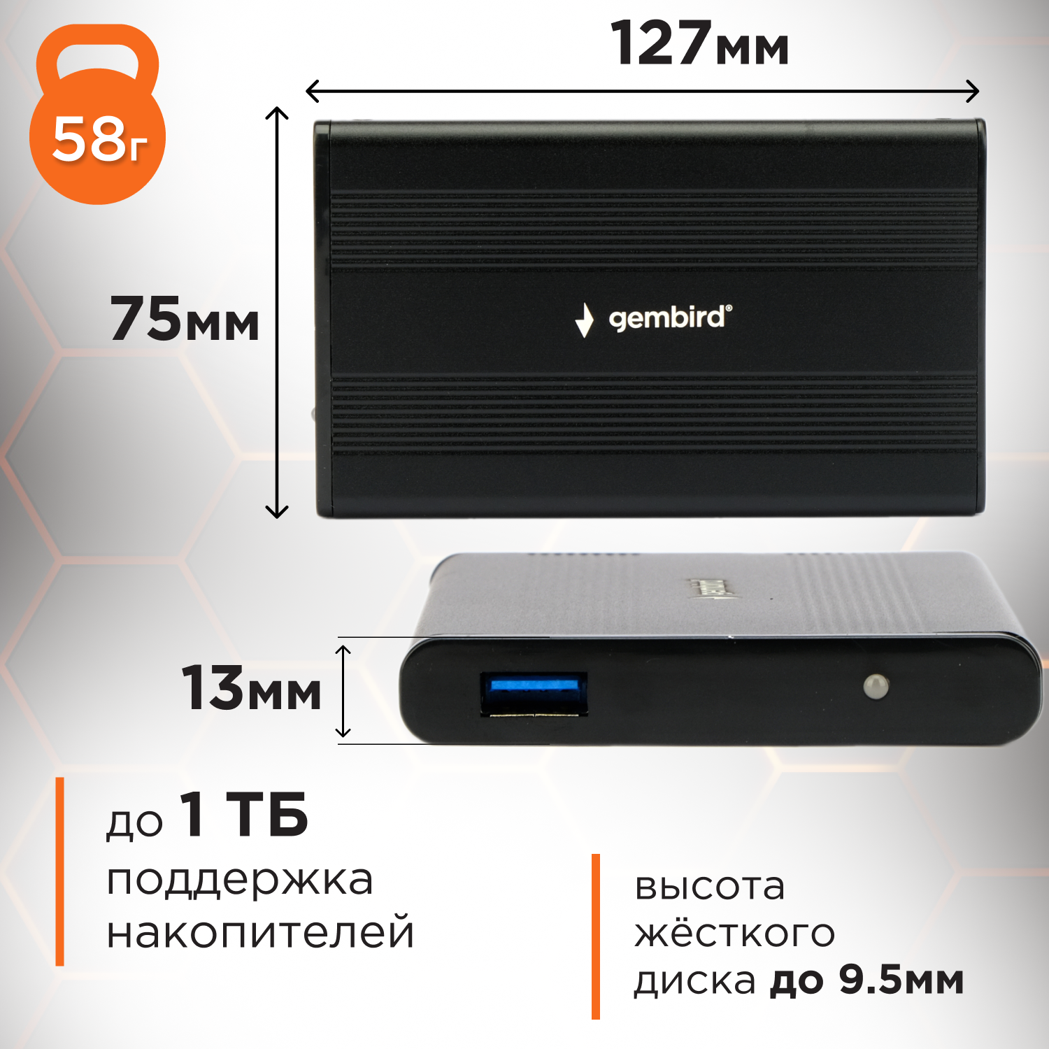 Корпус для SSD-HDD Gembird EE2-U2S-5 2.5 SATA до 750 Гб, алюминиевый, чёрный, usb 2.0