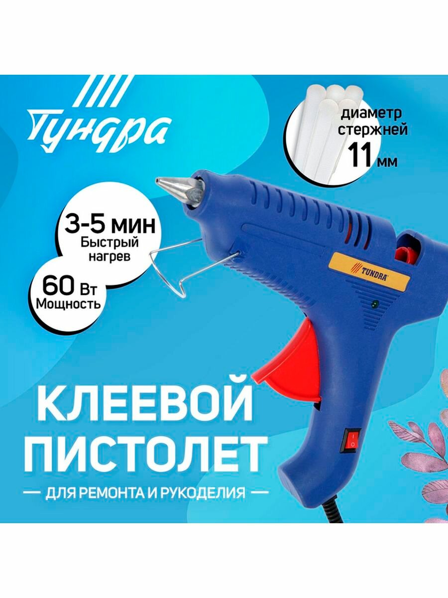 Клеевой пистолет тундра , 60 Вт, 220 В, шнур 1.2 м, выключатель, индикатор, антикапля, 11 мм 4365665