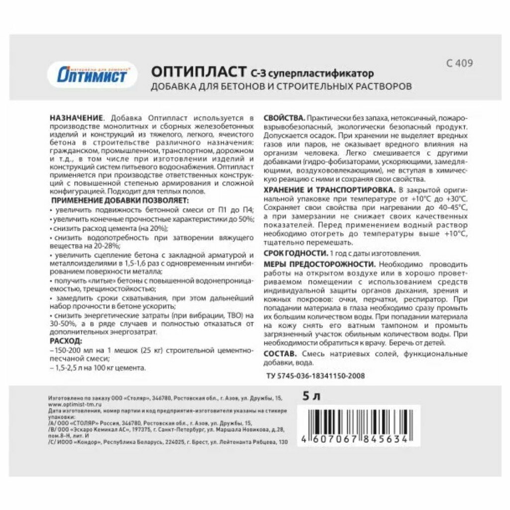 Добавка для бетона Оптимист Оптипласт С 409, 5 л