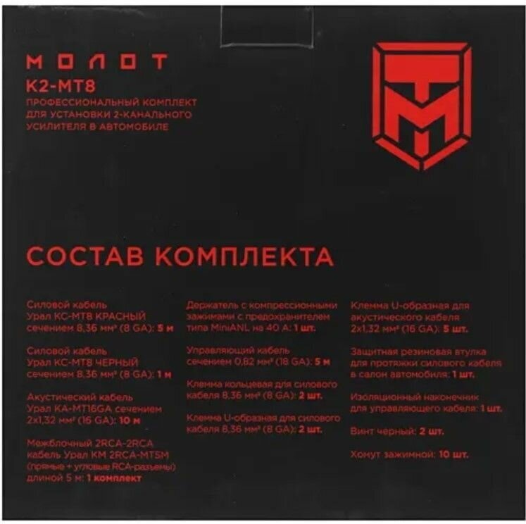 Профессиональный комплект кабелей и аксессуаров для установки автомобильного усилителя урал молот К2-МТ8