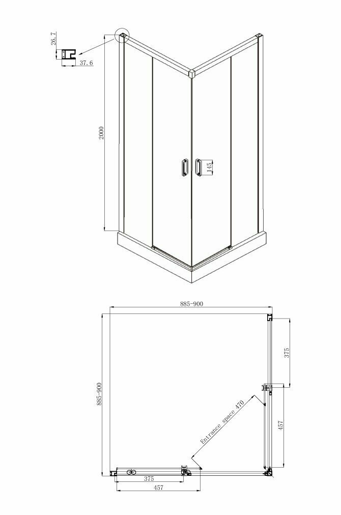 Душевой уголок 90х90 см с раздвижными дверями Ambassador Queen Black 11011203: душевое ограждение из стекла 6 мм, профиль черный