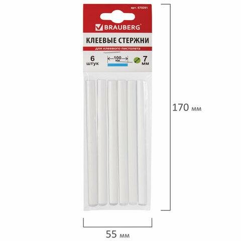 Клеевые стержни, диаметр 7 мм, длина 100 мм, белые, комплект 6 штук, BRAUBERG, европодвес, 670297 (цена за 1 ед.товара)