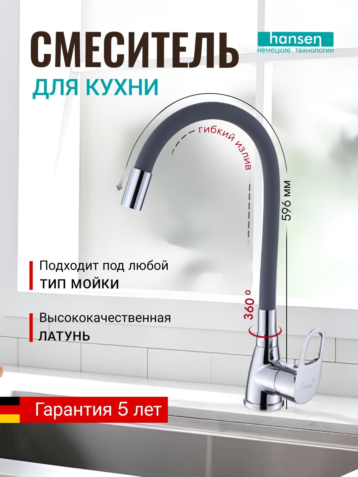 Смеситель для кухни Hansen H59004-P, с гибким поворотным изливом, серый
