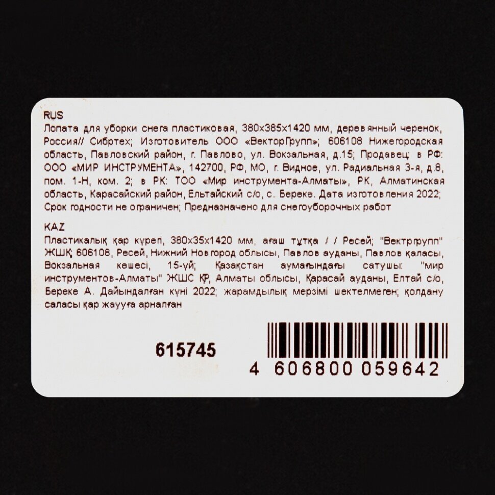 Лопата снеговая пластиковая 36х38 см с черенком Сибртех Россия 615745