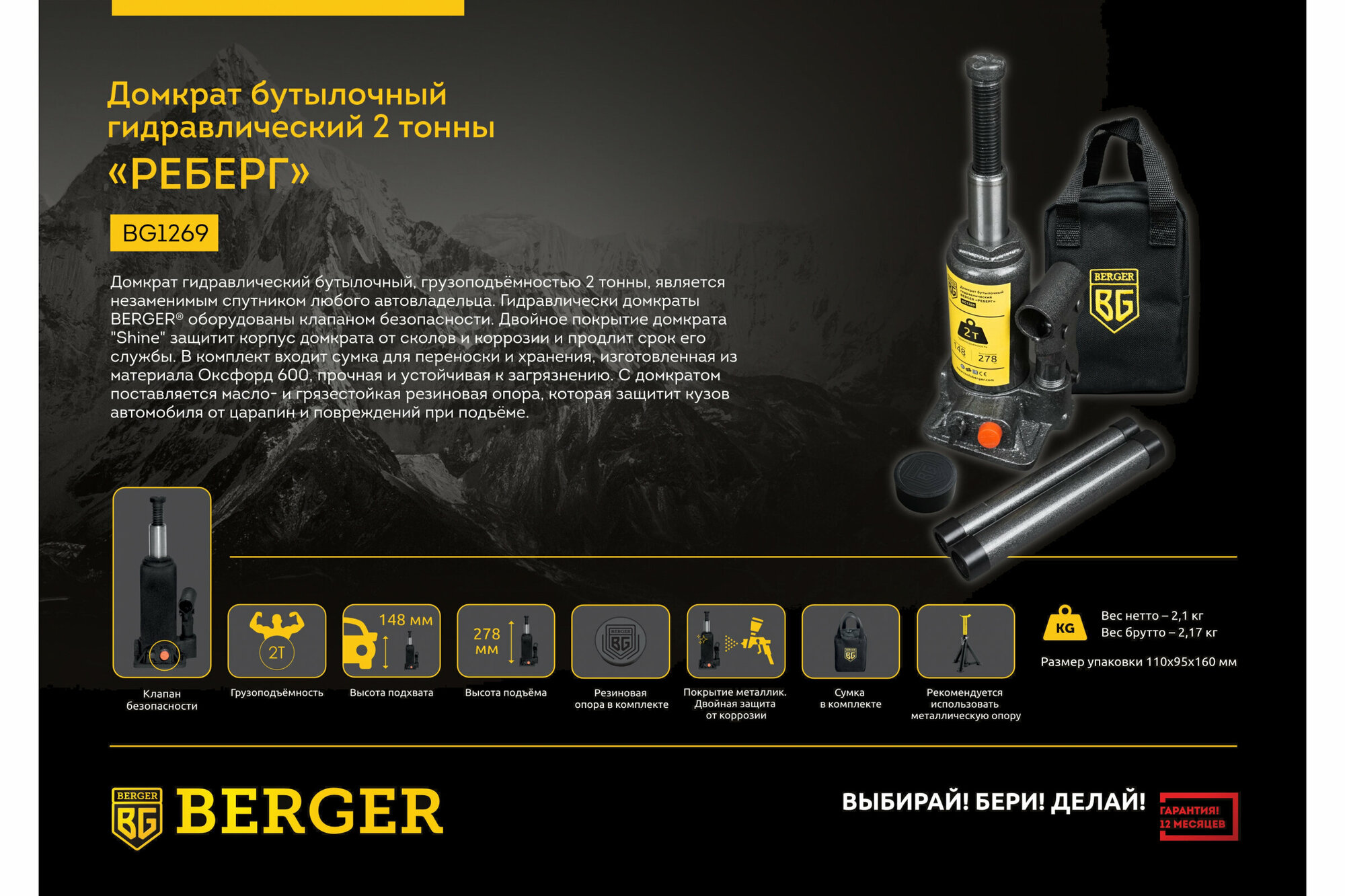 Домкрат бутылочный гидравлический Berger Брухберг, BG1271, нагрузка 6
