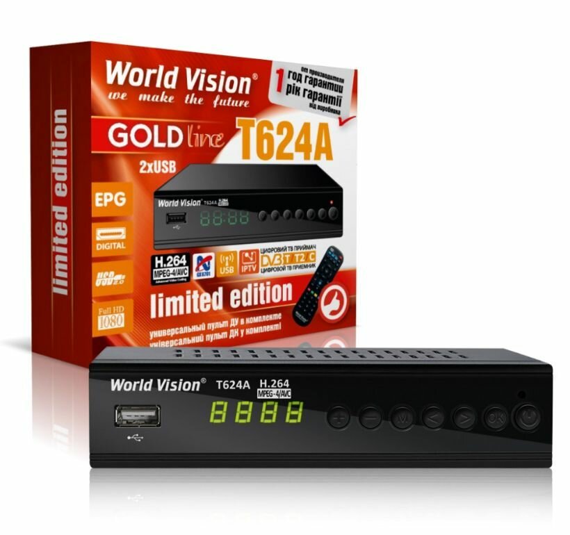 Эфирная приставка World Vision T624A (T2+C,металл,кнопки,дисплей,IPTV,обучаемый ПДУ)