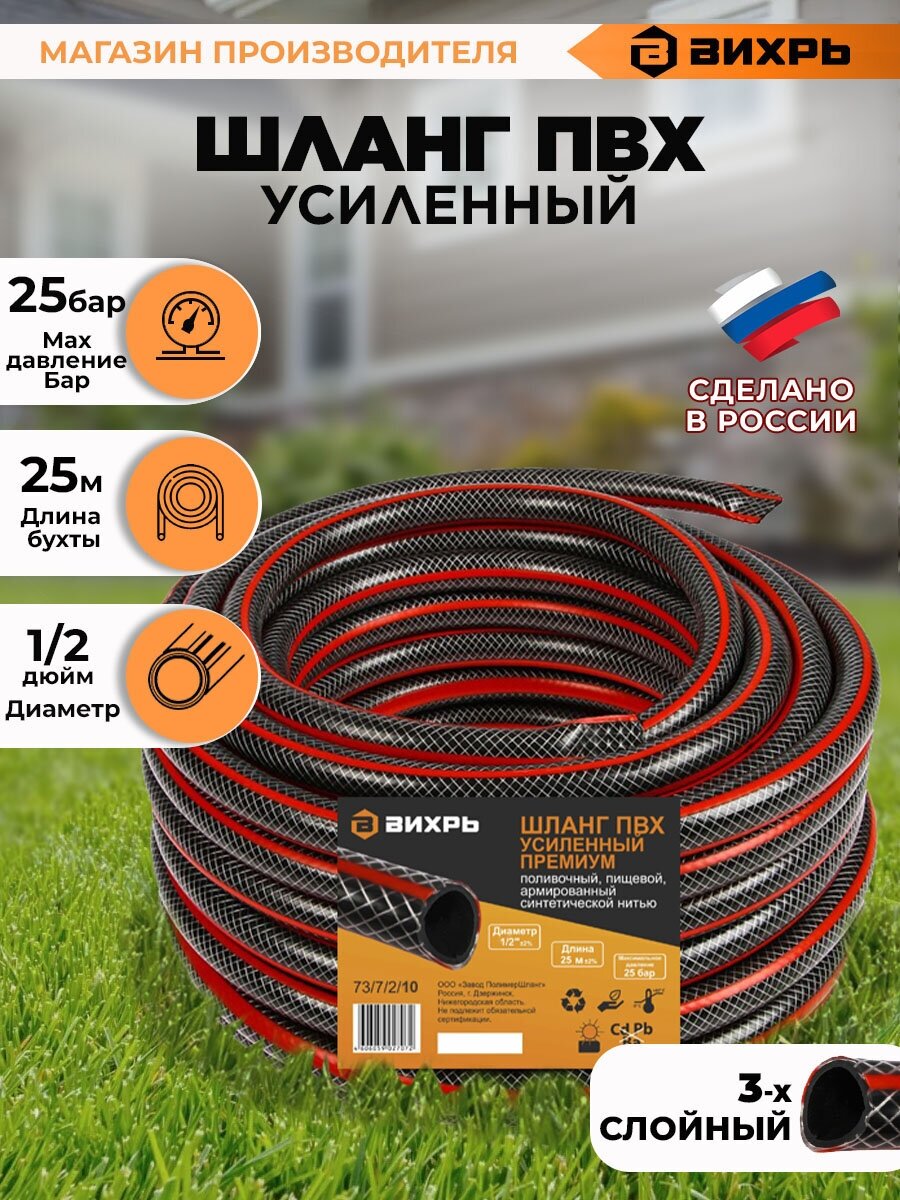 Шланг поливочный Вихрь ПВХ усиленный премиум, пищевой трехслойный армированный 1/2, 25м, 73/7/2/10