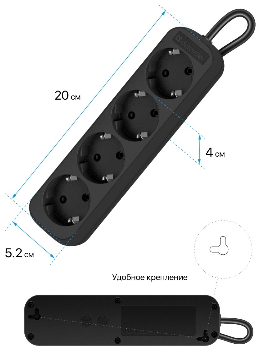 Удлинитель Defender M430, 4 розетки, 3 м, с/з, 10А / 2200 Вт черный