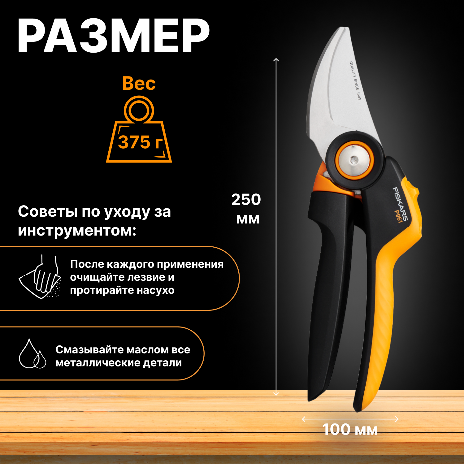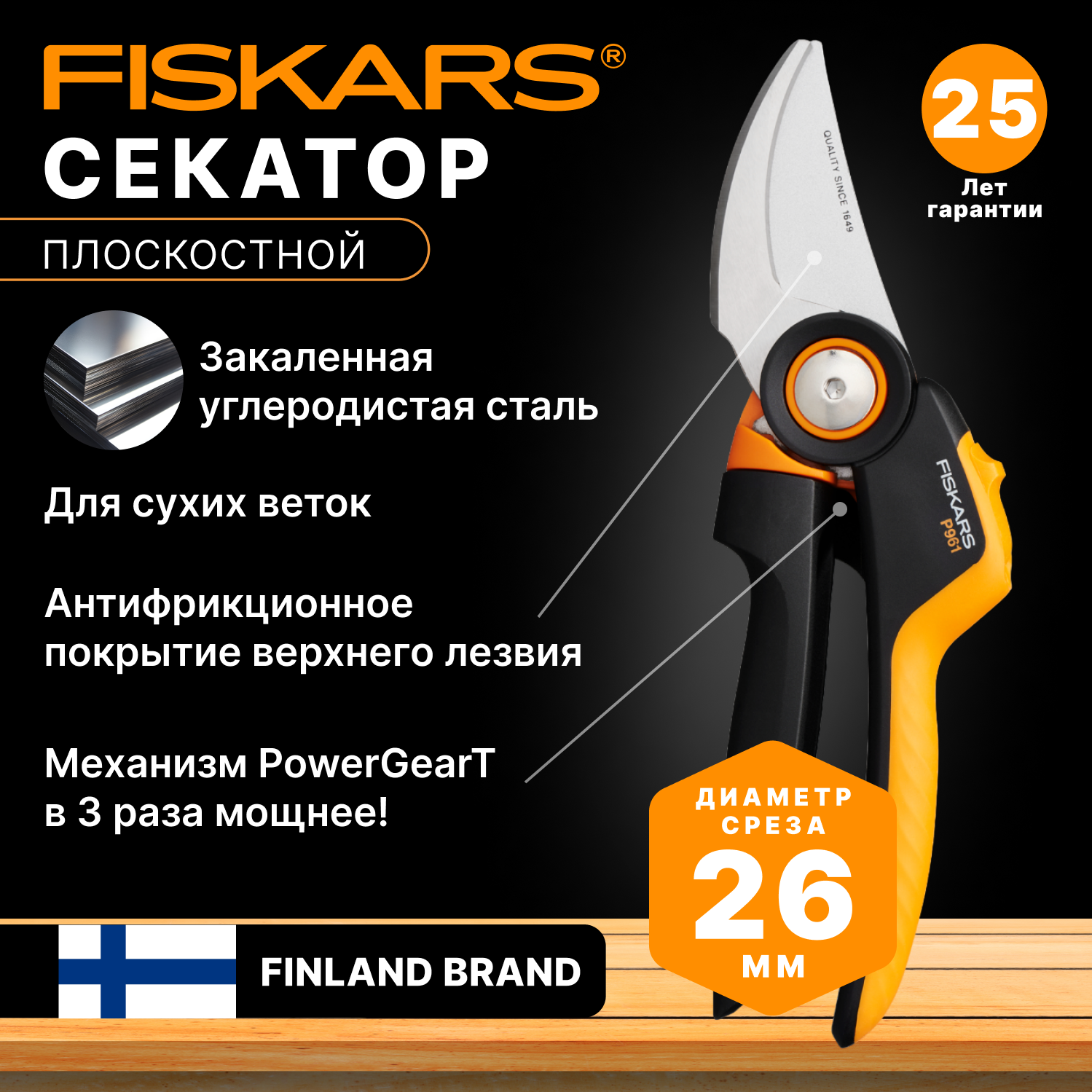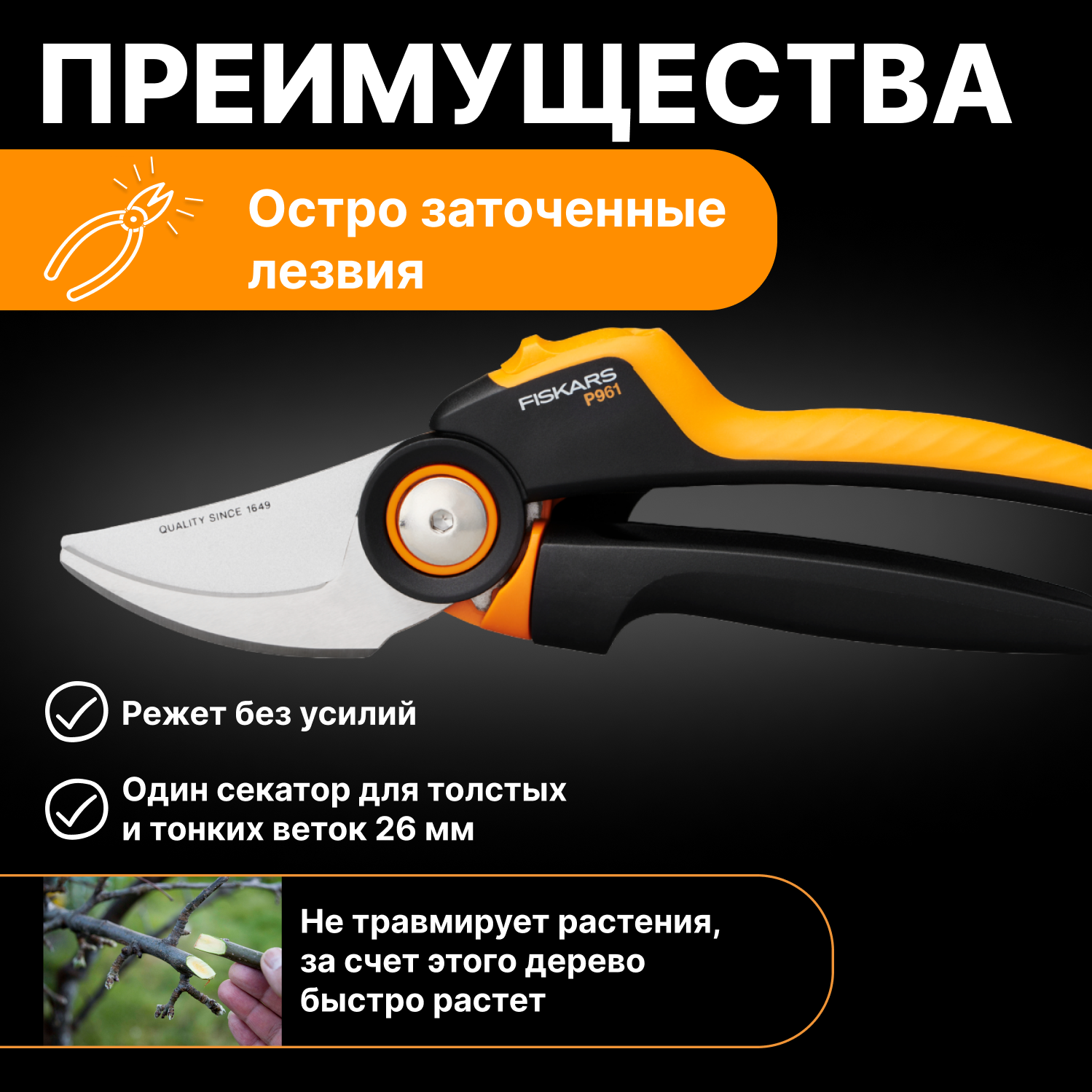 Секатор плоскостной Fiskars PowerGear P961 черный/оранжевый (1057175)