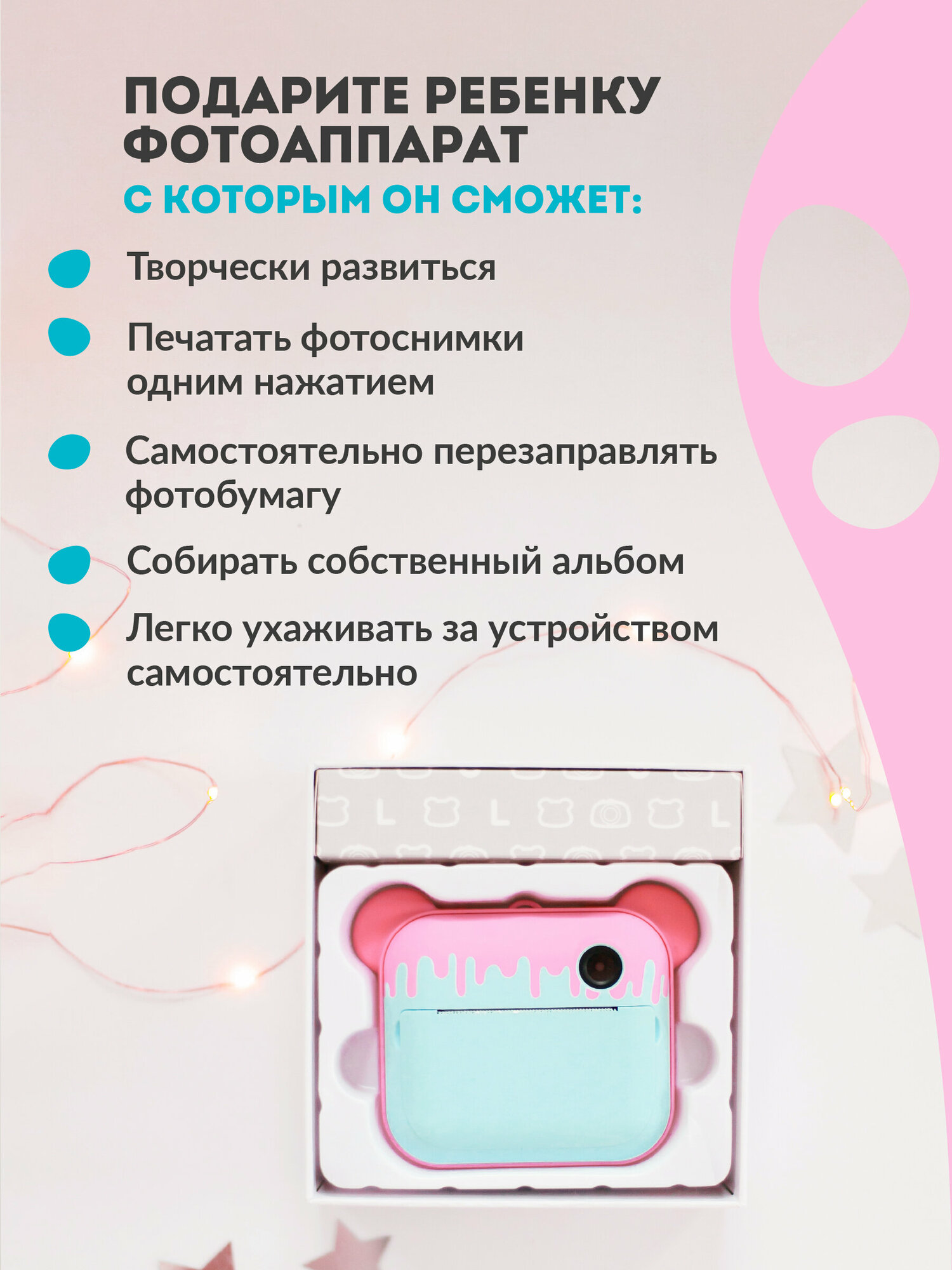 Покупал племяннице, но в итоге игрался сам не меньше. Выгодно отличается от полароида/инстакса тем, что фотки сохраняются на карту и их: 1) Можно напечатать в нескольких экземплярах. 2) Можно не печатать, если не нравится и не тратить лишнюю ленту. |