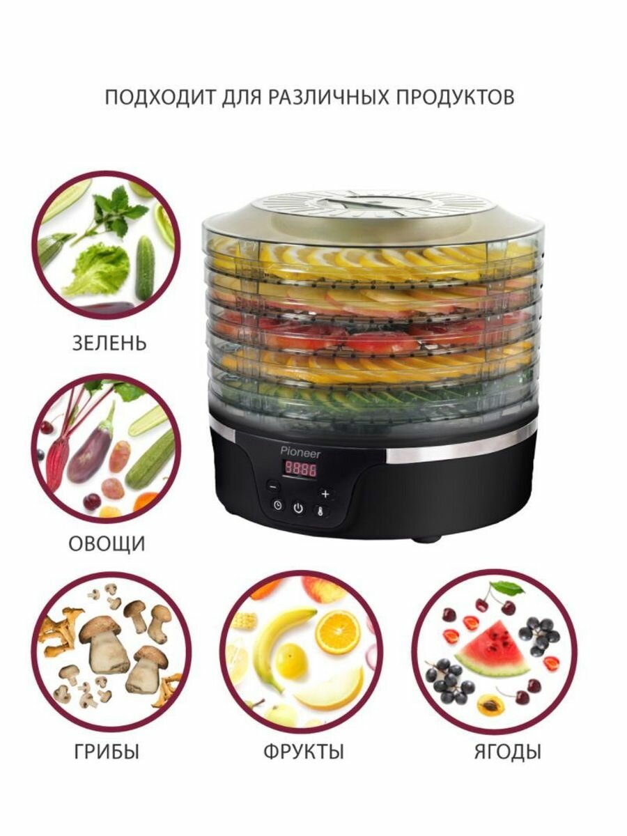 Электросушилка для овощей, фруктов, ягод и грибов Pioneer с LED-дисплеем, ускоренной подачей воздуха, регулировкой температуры и таймером, 5 съемных поддонов, 380 Вт интересное: