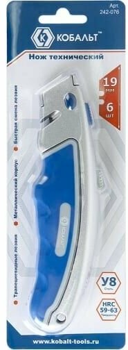 Технический нож, трапециевидные лезвия 19мм 6шт, металлический корпус, быстрая смена лезвия кобальт 242-076
