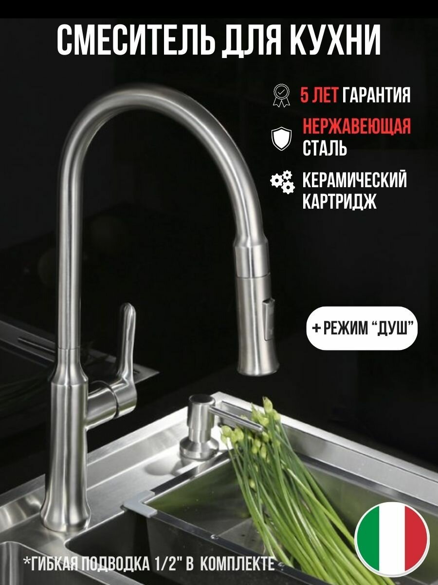 BelBagno Смеситель BelBagno BB-LAM38-IN для кухни, с выдвижным изливом, двухрежимный, сатин