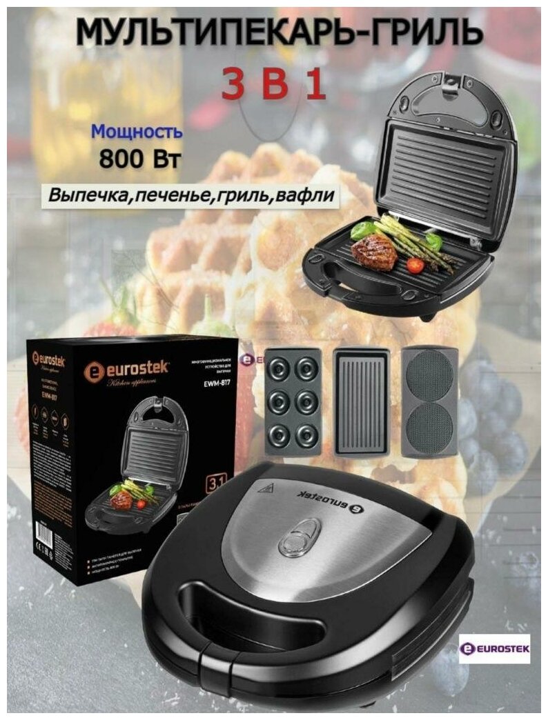 Мультипекарь Eurostek EWM-817 /800Вт, голландские вафли, гриль, выпечка и печенье интересное: