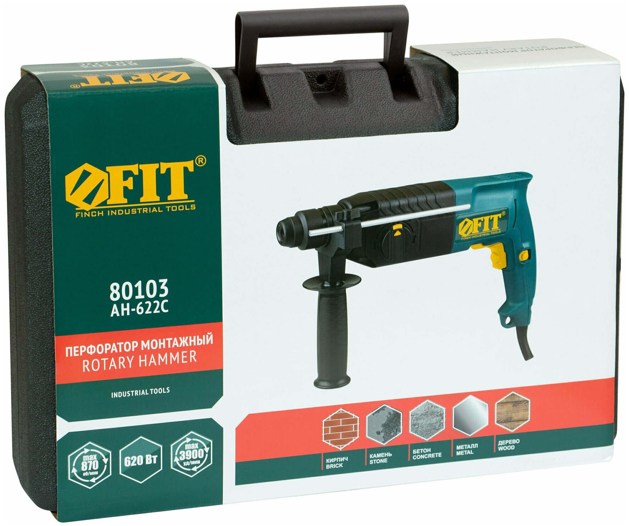Купить Перфоратор Монтажный 620 Вт; 0-870 об/мин; 0-3900 уд/мин; 2,6 Дж; 3 реж.; SDS-plus; реверс; 3,1 кг ; кейс FIT 80103