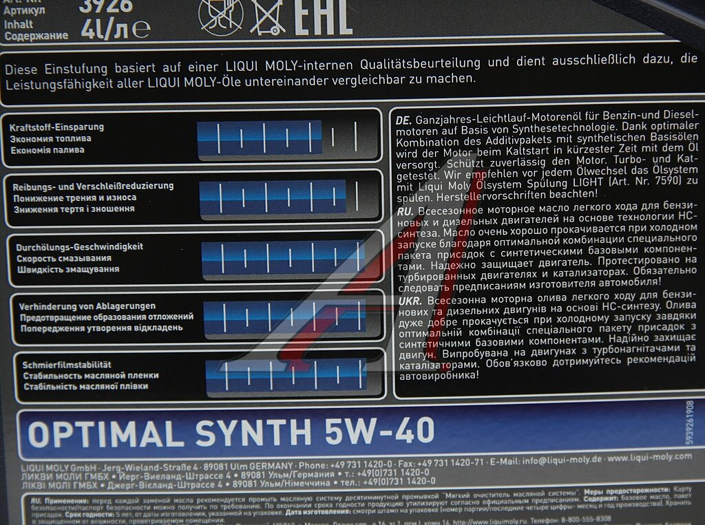 Моторное масло LIQUI MOLY Optimal Synth 5W-40, 4 л, артикул 3926