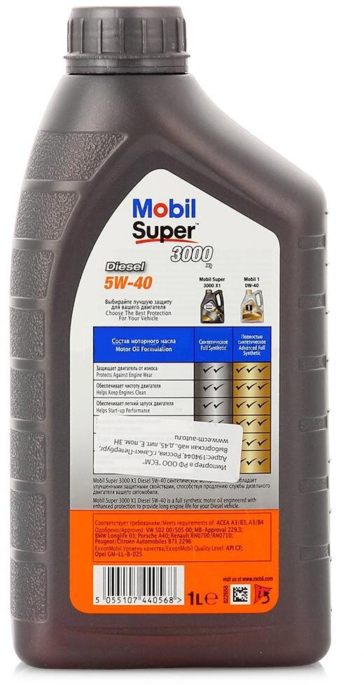 Масло моторное Mobil Super 3000 X1 Diesel 5w40 синтетическое, CF, ACEA A3/B3/B4, для дизельного двигателя, 1л, арт. 152573