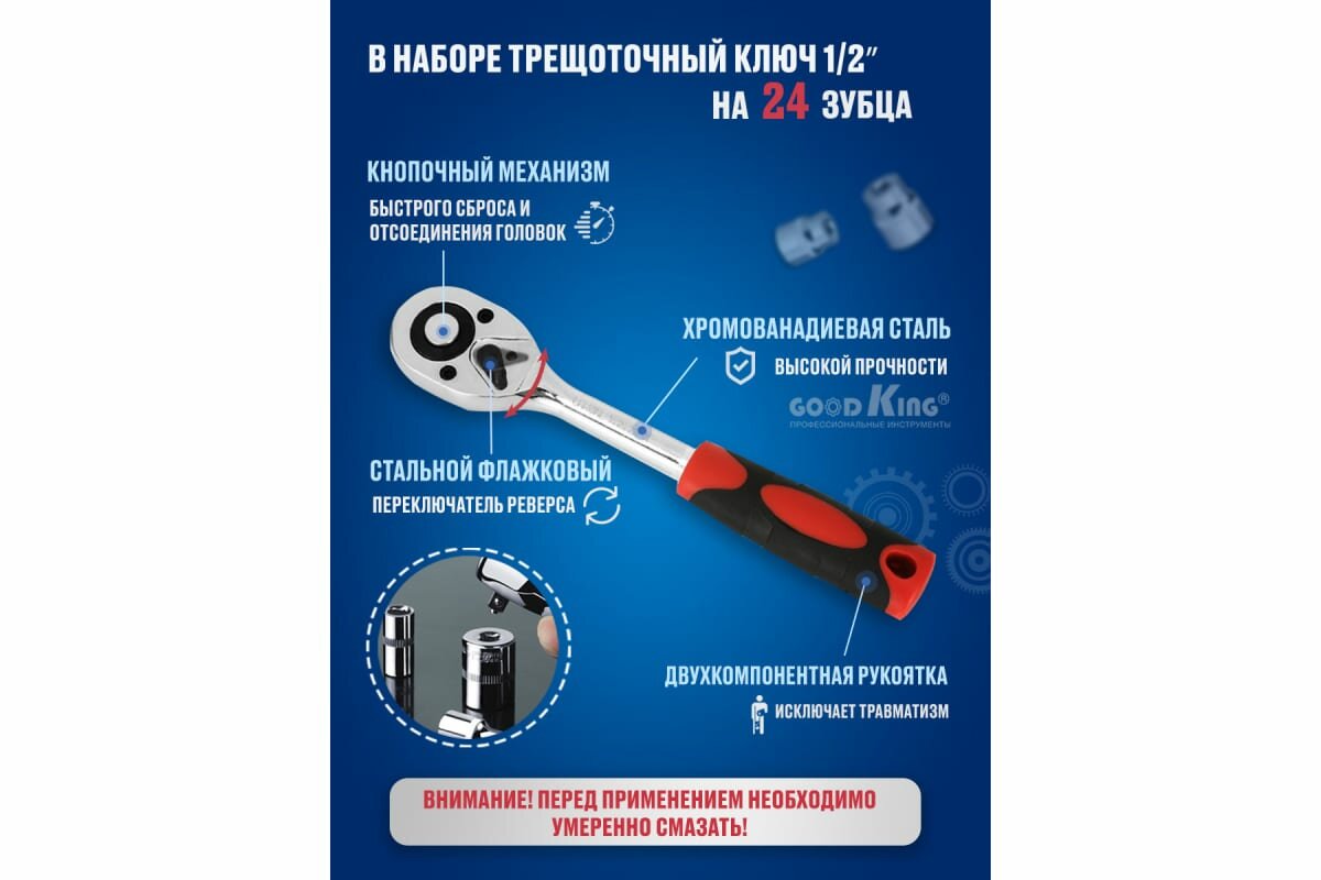 Набор торцевых головок с трещоткой для авто Goodking T-1212, 12 предметов, трещотка 24 зубца 1/2" .