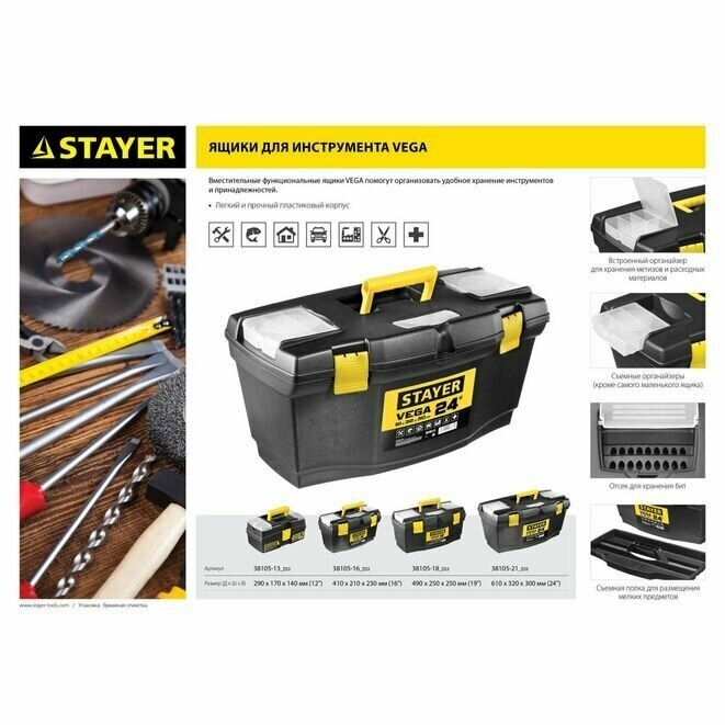 STAYER VEGA-16, 410 x 210 x 230 мм, (16″), пластиковый ящик для инструментов (38105-16) интересное: