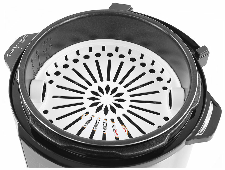 | Минусы: | Короткий провод, металл на перегородка на крышке похож на алюминий, как и у всех скороварок. Хотелось бы нержавейку. Небольшие пластиковые пупырики на клапане - на работу никак не влияют, просто косметический косяк, мне кажется. Другие бы и не заметили, я впервые заказывала на Яндекс, поэтому все осматривала. Нет книги рецептов. Но это все мелочи -можно любые рецепты использовать. |