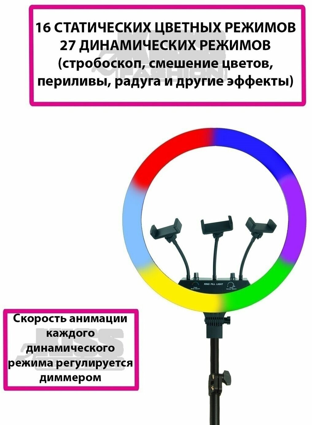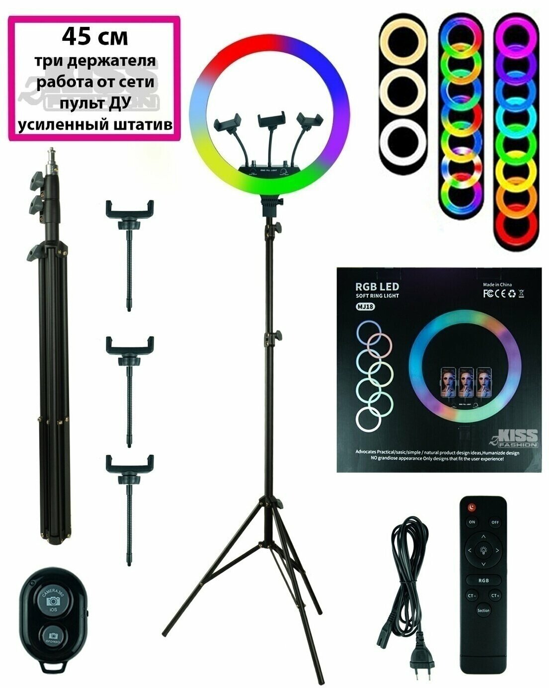 Кольцевая LED лампа 45 см zKissFashion RGB цветная со усиленным напольым штативом держателем для телефона и селфи пультом. Модель 123290 интересное: