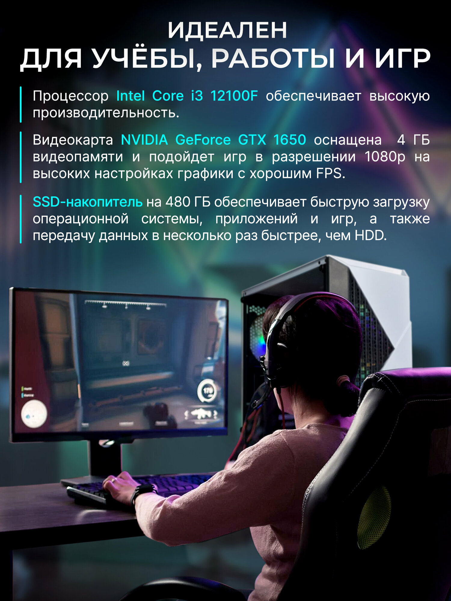 Игровой компьютер F22 Raptor V3 NEW / Intel Core i3-12100F / 16GB / 480GB SSD / GTX 1650 4GB / H610M / 500W / Win10Pro / MS Office / WiFi