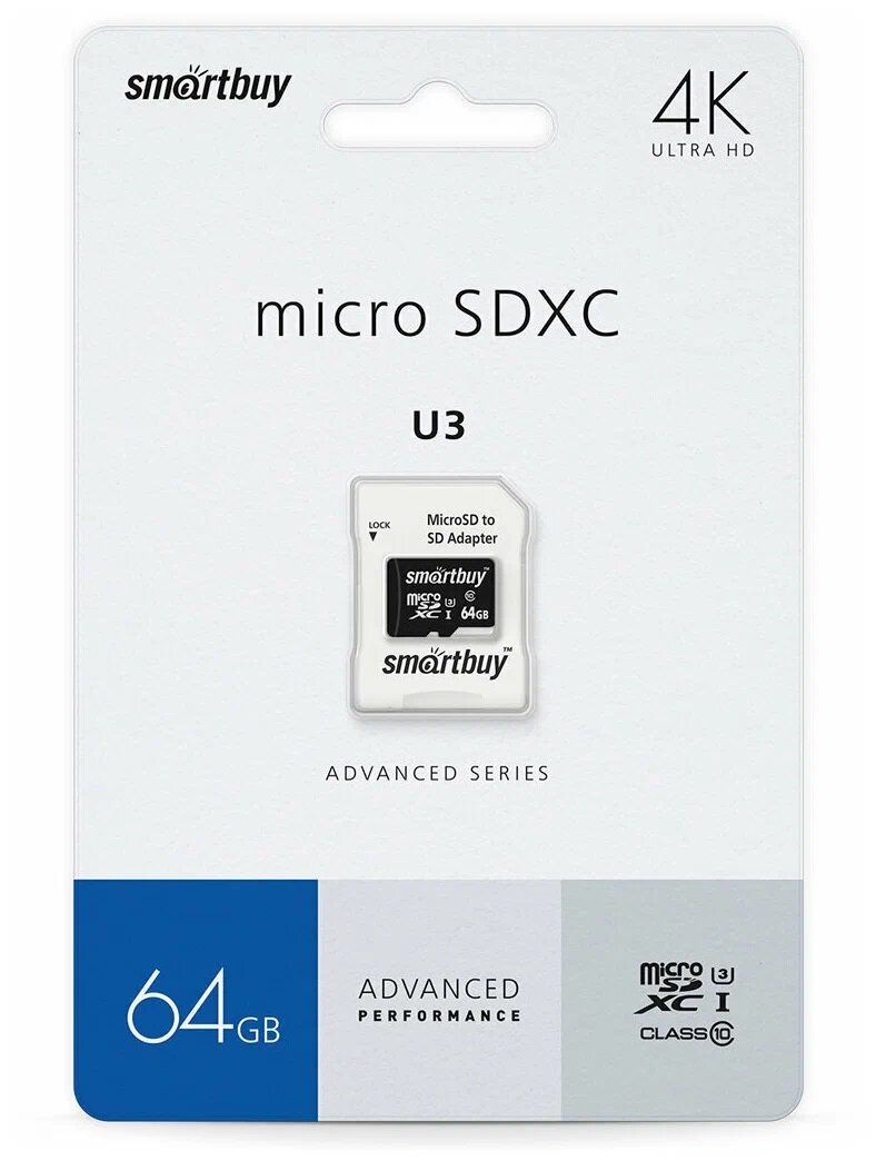 Ниже Вы можете прочитать отзывы на Карта памяти SmartBuy Advanced Series microSDHC 64 ГБ Class 10, UHS-I U3, R/W 90/55 МБ/с, адаптер на SD, ознакомится с подробными характеристиками, посмотреть интересные обзоры и фотографии на Карта памяти SmartBuy Advanced Series microSDHC 64 ГБ Class 10, UHS-I U3, R/W 90/55 МБ/с, адаптер на SD.