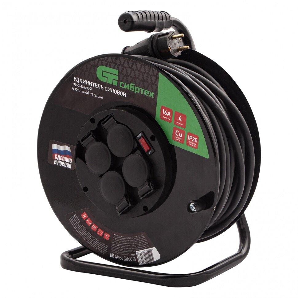 Удлинитель силовой 50 м, 16А, тип УХз16, ПВС 3 x 2.5 мм, на стальной катушке, 4 розетки Сибртех