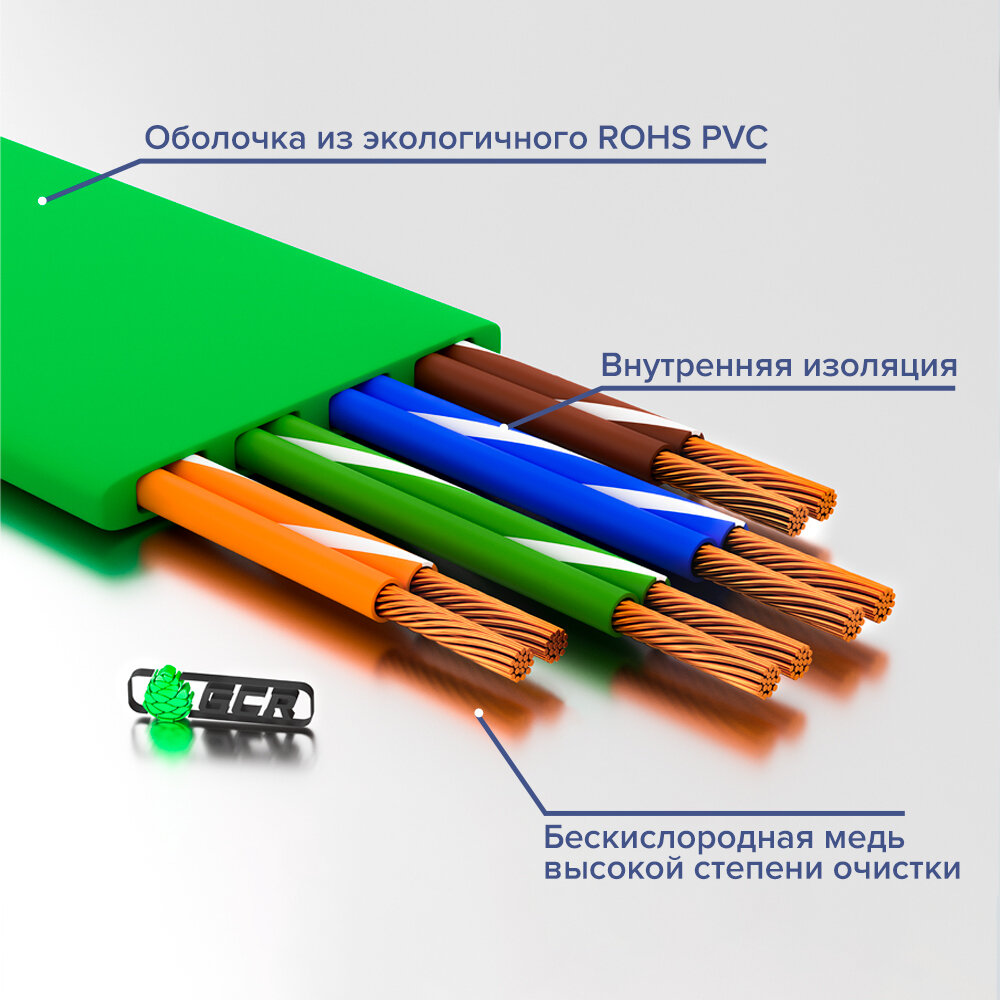LAN кабель 15м GCR PROF плоский UTP cat.6 10 Гбит/с RJ45 LAN кабель для интернета медный контакты 24K GOLD (GCR-LNC62) зеленый